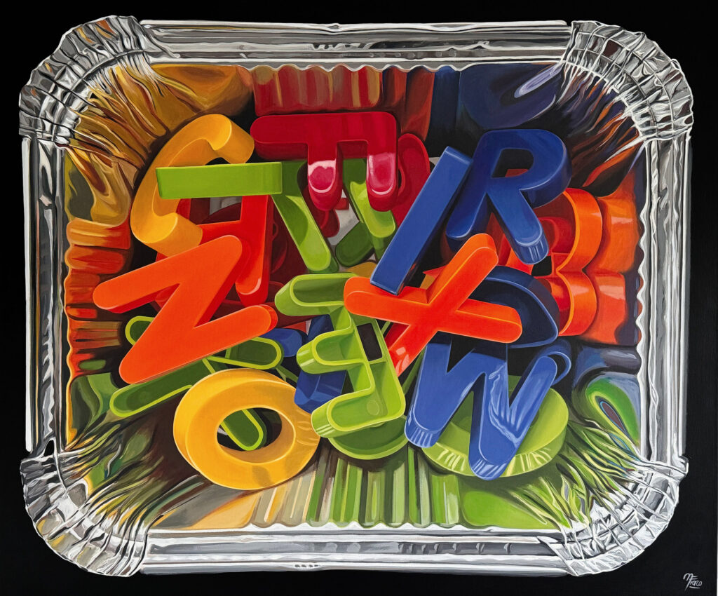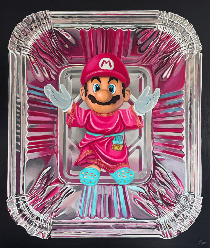 This section highlights Mauricio Franco’s unique critique of consumerism through vivid, hyperrealistic art.